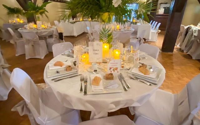 - 15 tables rondes de 1.25 m de diamètre (6 à 8 personnes)